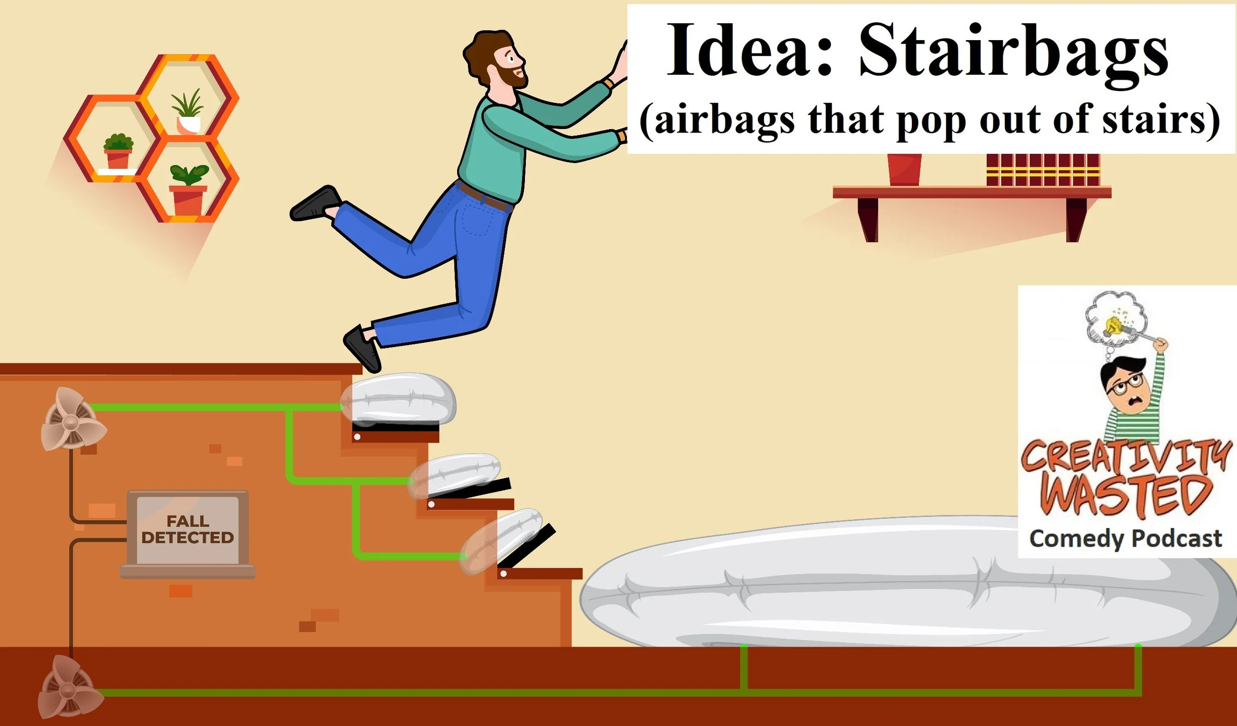 Idea: A service that uses artificial intelligence to detect if you're falling down the stairs and quickly deploy a safety mechanism to minimize your injuries, such as inflatable bags that shoot forward out of the vertical portion of each stair ("stairbags"), walls that swing out to block your way before you gain momentum, or stairs that turn into a slip-n-slide with a soft landing of some sort at the bottom of the stairwell. Also: using a vat of pudding or food at the bottom of the stairs, so if you're injured and you can't get up, you can survive on the food for days or weeks; safety concerns about using a vat of alcohol at the bottom of the stairs; using slip-n-slide stairs as a security mechanism to keep burglars from going up the stairs and (optionally) to impale them at the bottom of the stairs